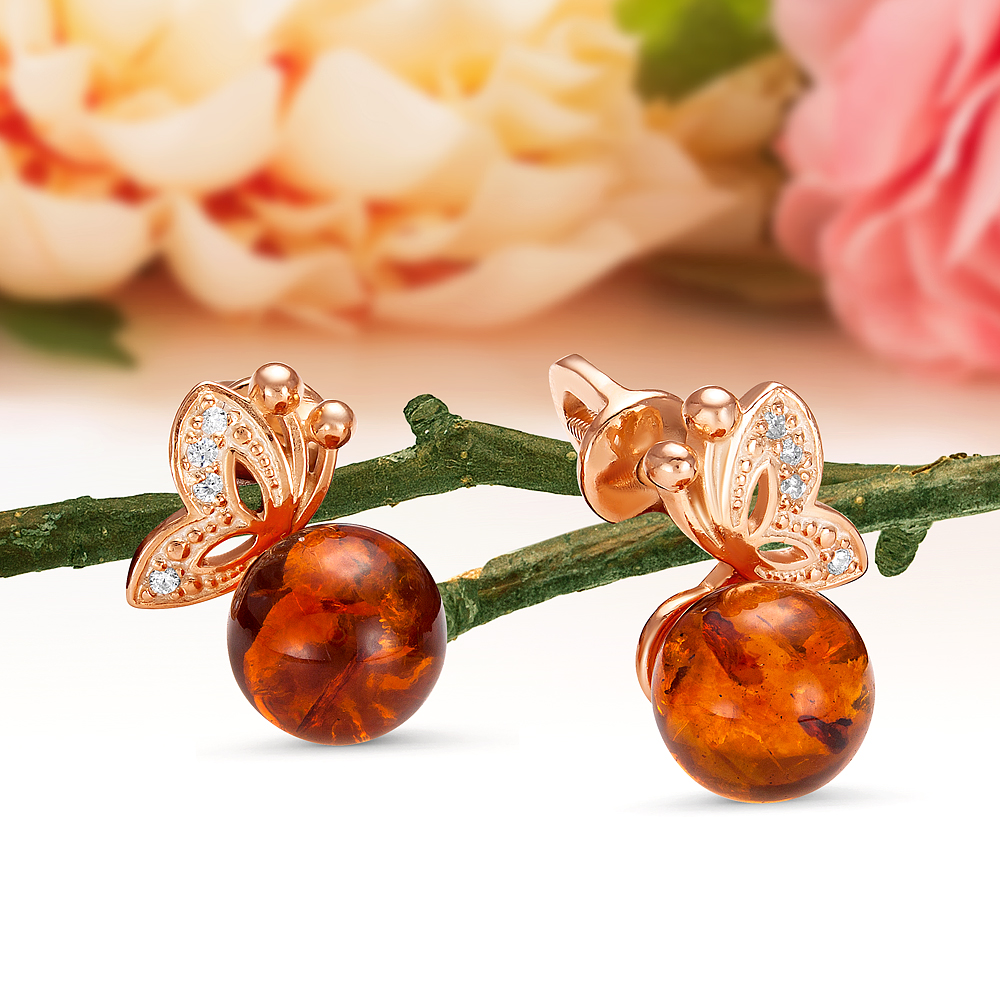 Серьги "Бабочки" из серебра 925 пробы с коньячным балтийским янтарем