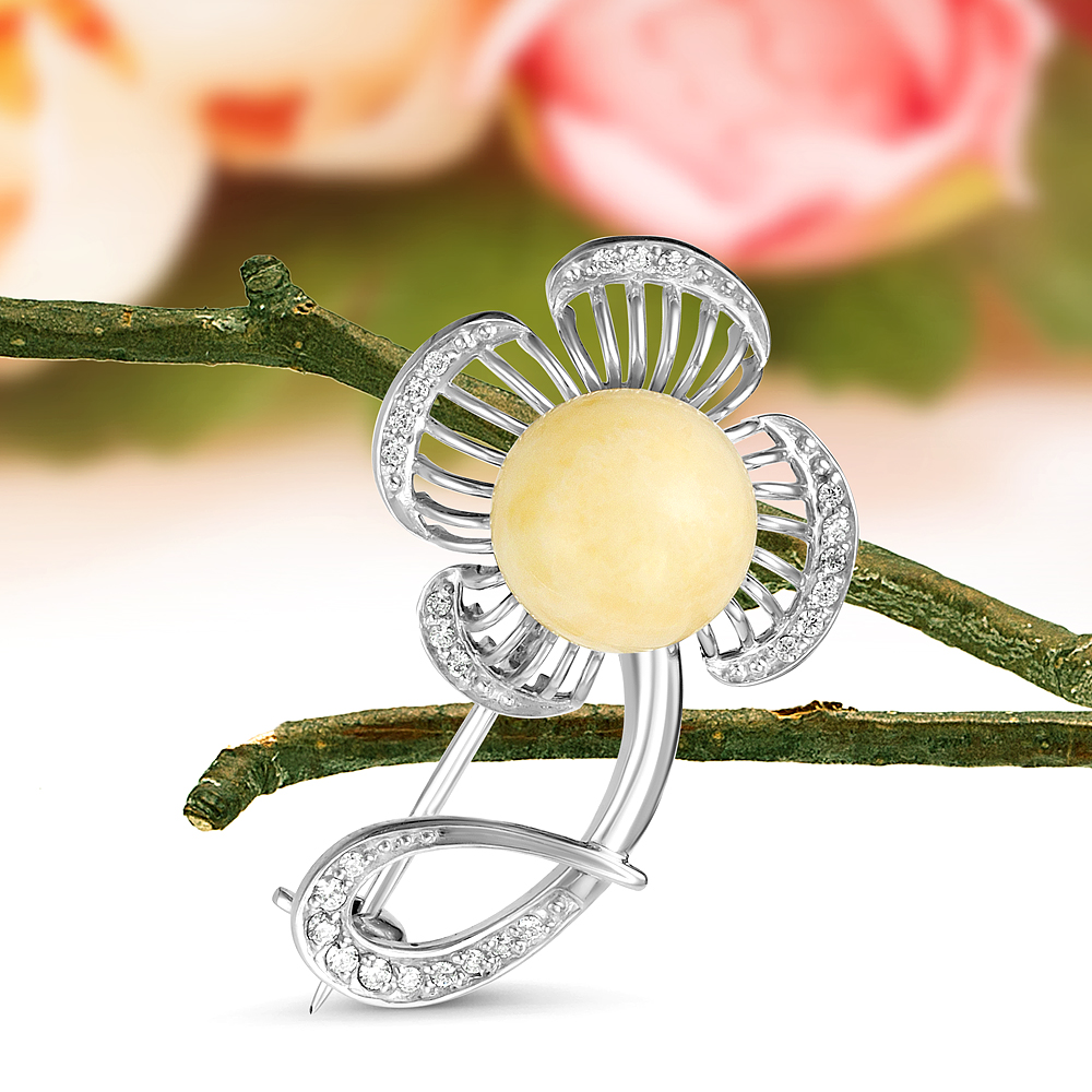 Брошь "Цветок" из серебра 925 пробы с лимонным балтийским янтарем