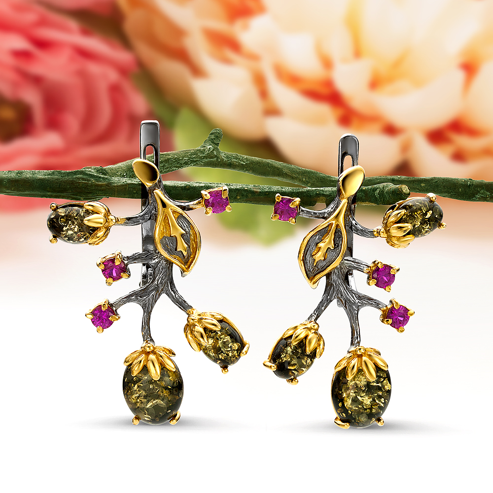 Серьги "Тюльпаны" из серебра 925 пробы с зеленым балтийским янтарем