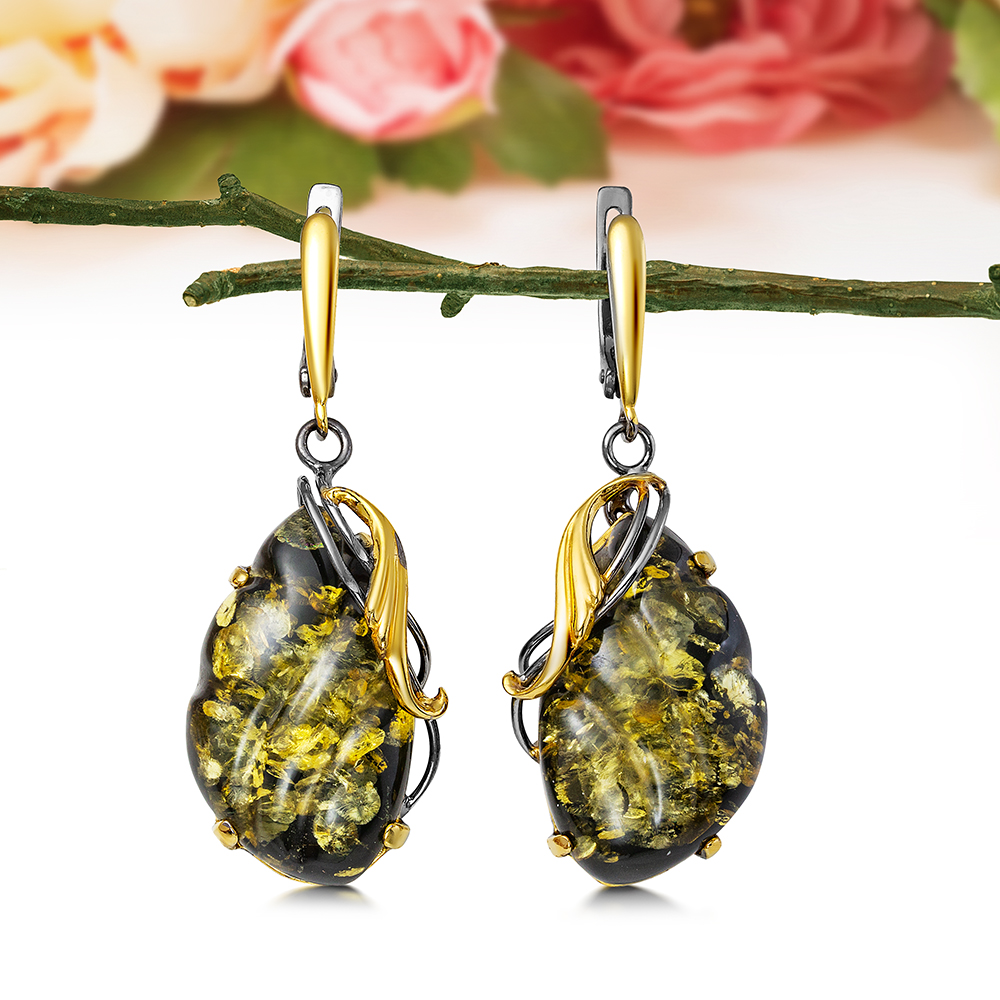 Серьги "Полночь" из серебра с зеленым балтийским янтарем