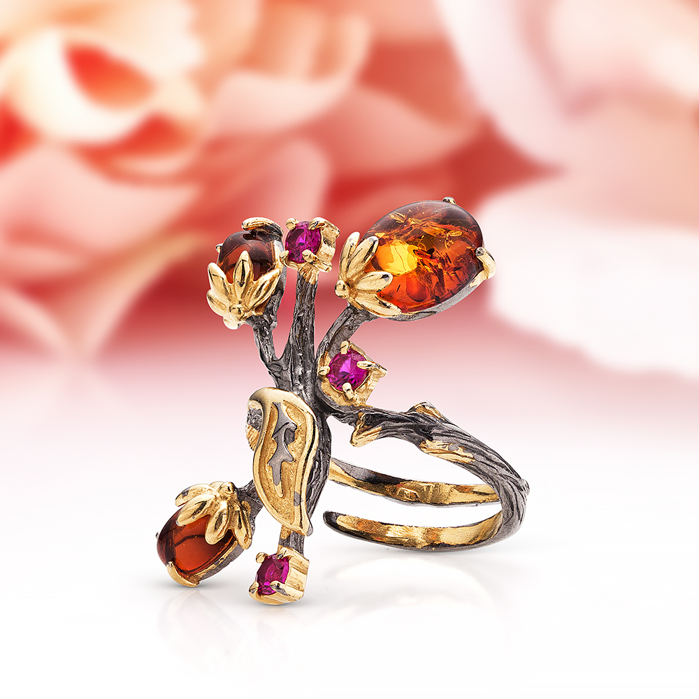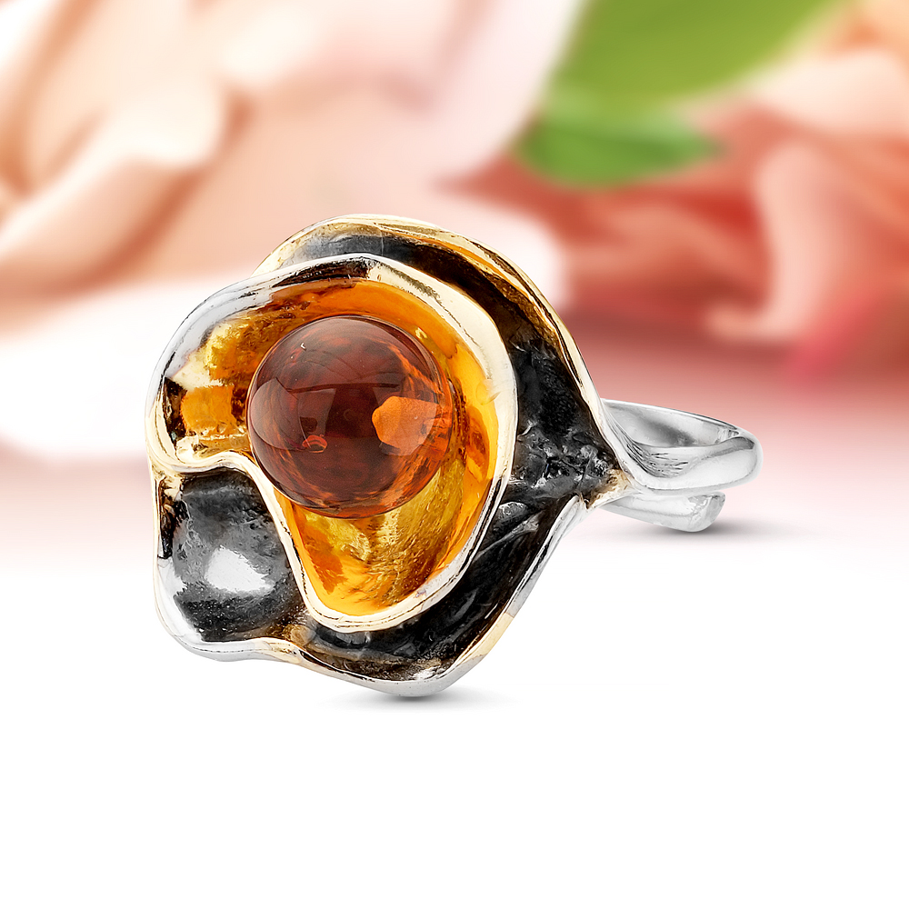 Кольцо "Тюльпаны" из серебра 925 пробы с коньячным балтийским янтарем