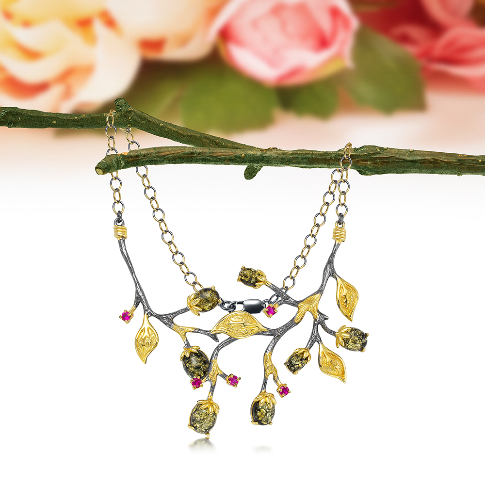 Колье "Тюльпаны" из серебра 925 пробы с зеленым янтарем