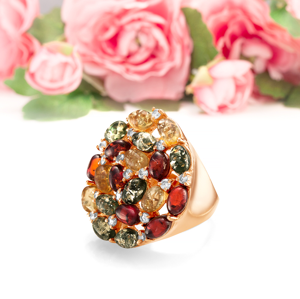 Кольцо "Роза" из серебра 925 пробы с коньячным балтийским янтарем