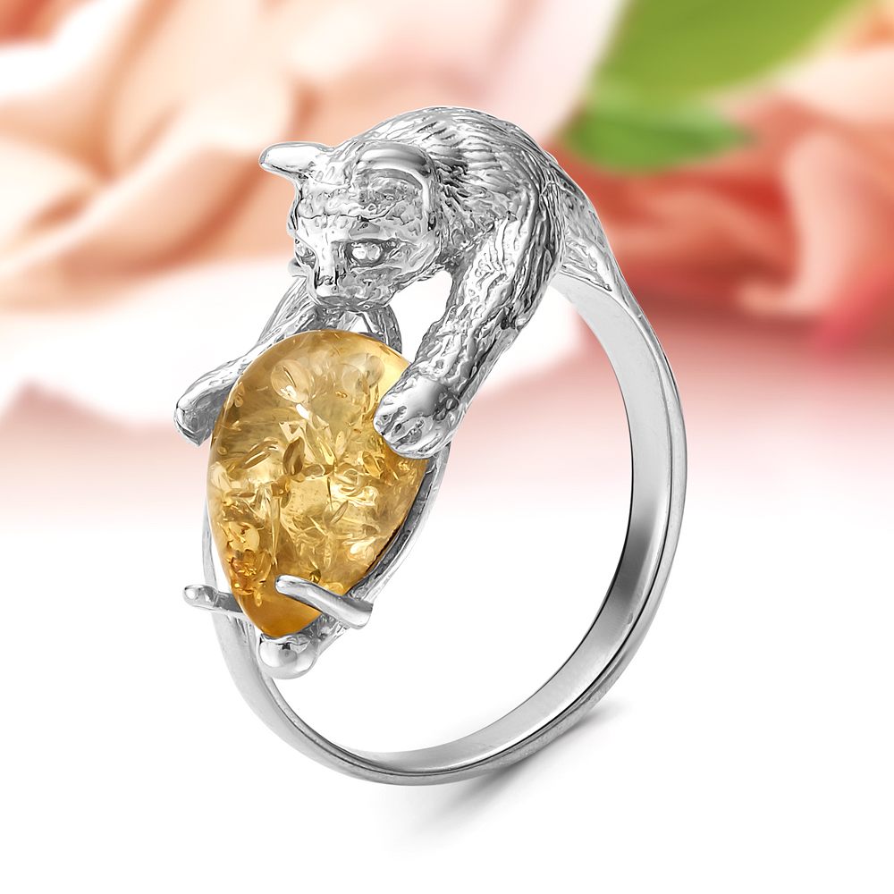 Кольцо "Снежный Барс" из серебра 925 пробы с лимонным балтийским янтарем