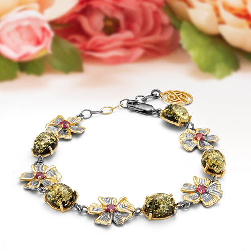 Браслет "Весенняя сказка" из зеленого балтийского янтаря в серебре