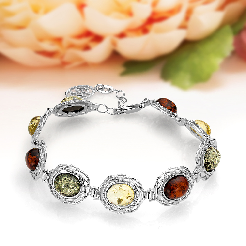 Браслет из натурального балтийского янтаря "микс" в серебре 925 пробы