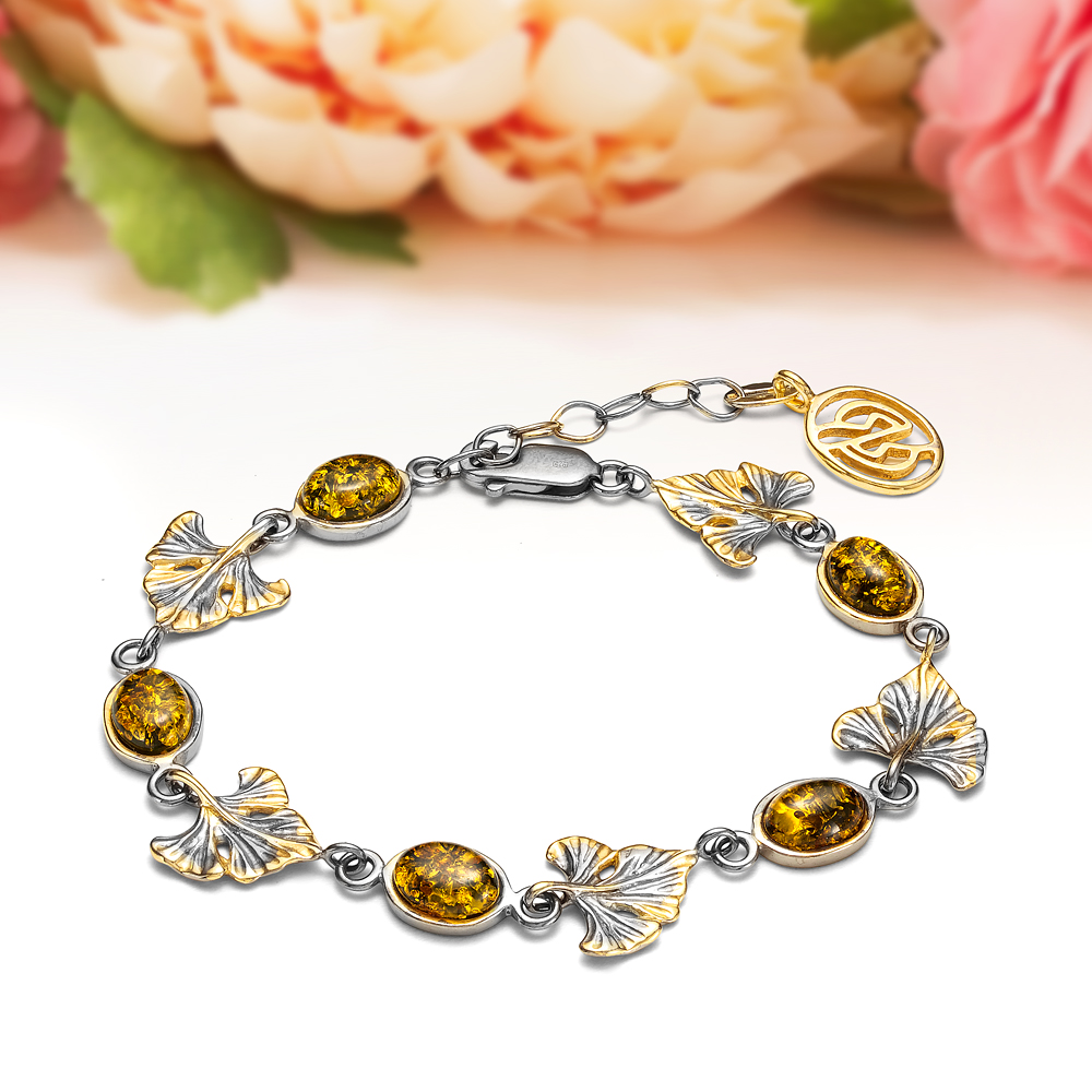 Браслет "Ажур" из серебра с позолотой с зеленым балтийским янтарем