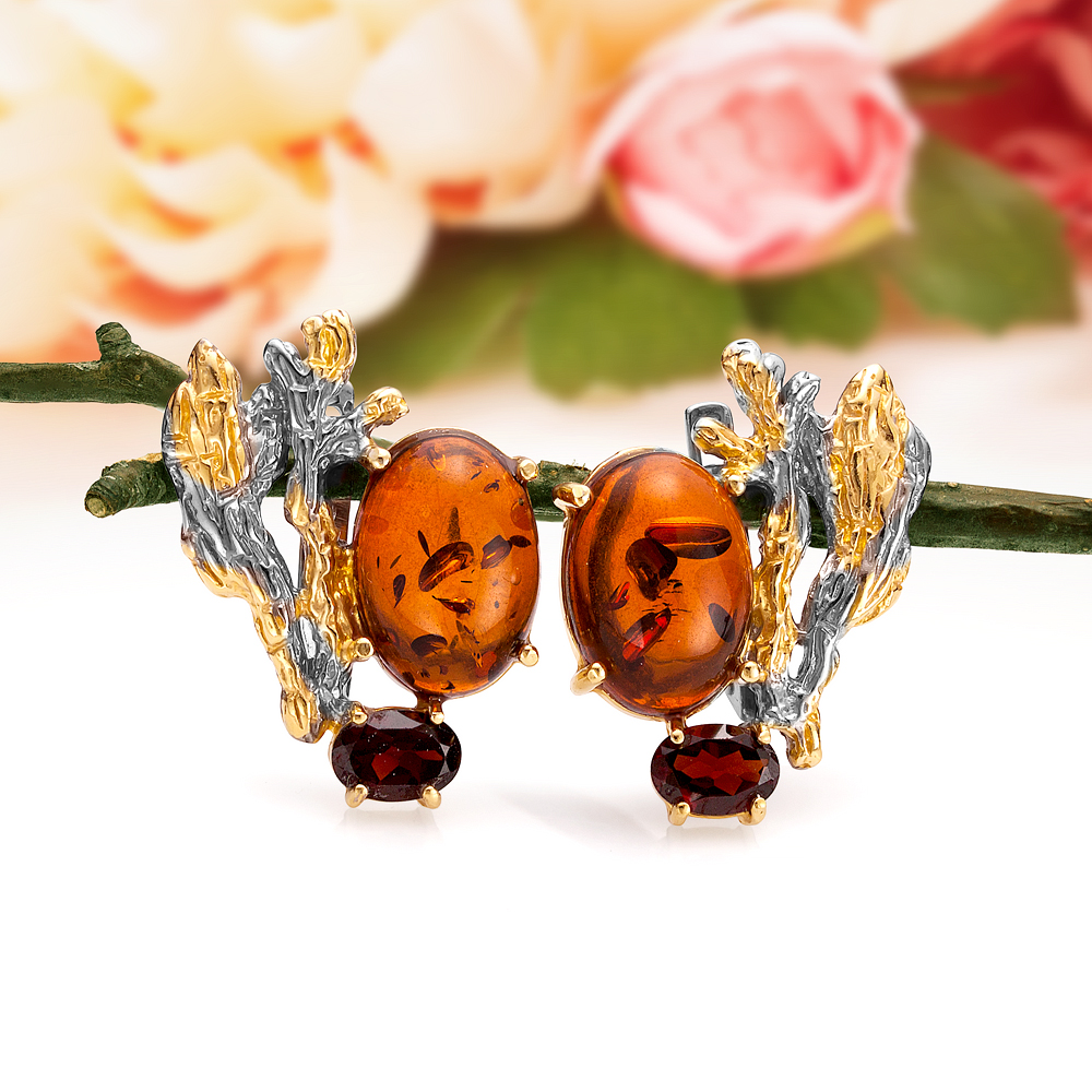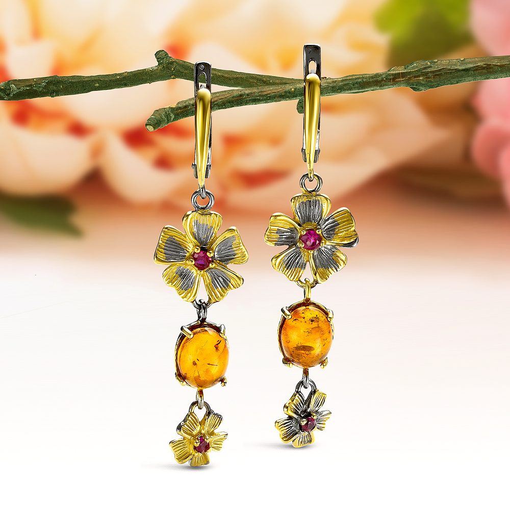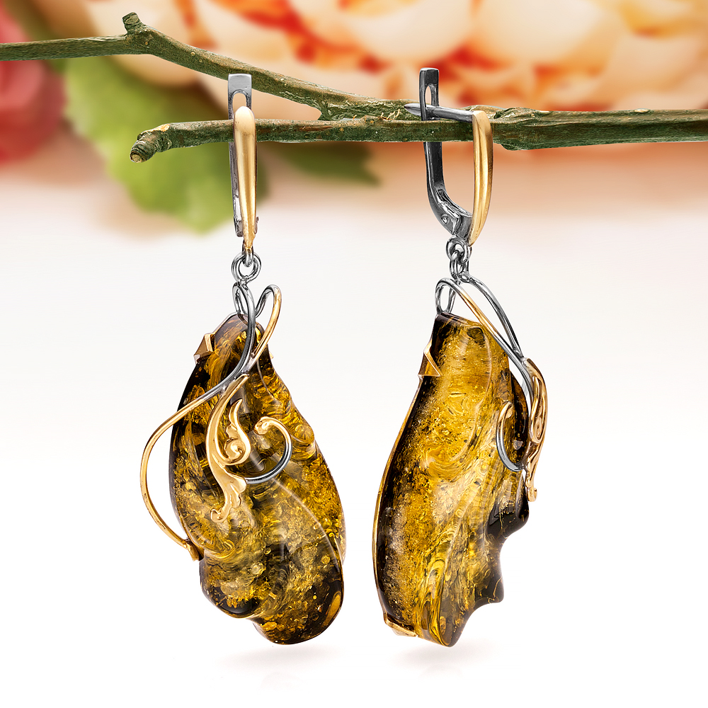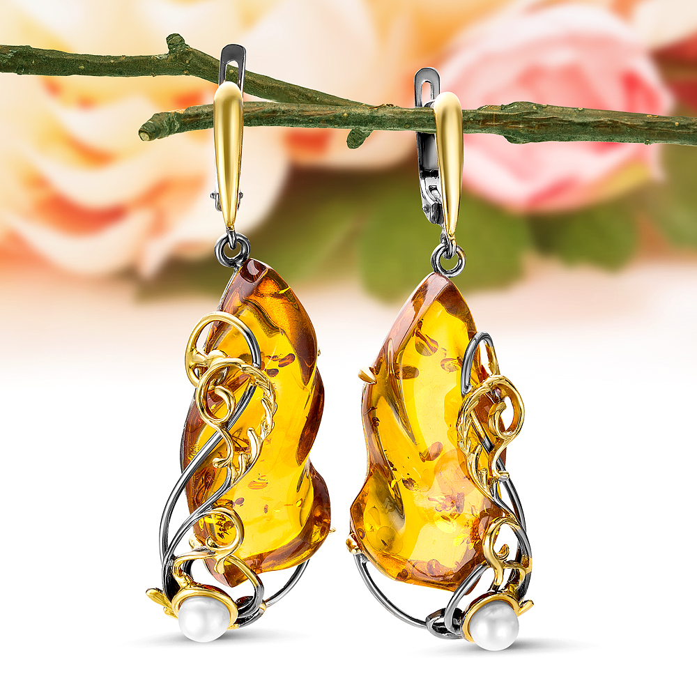 Серьги из серебра 925 пробы "Сказка", украшенные природным янтарем