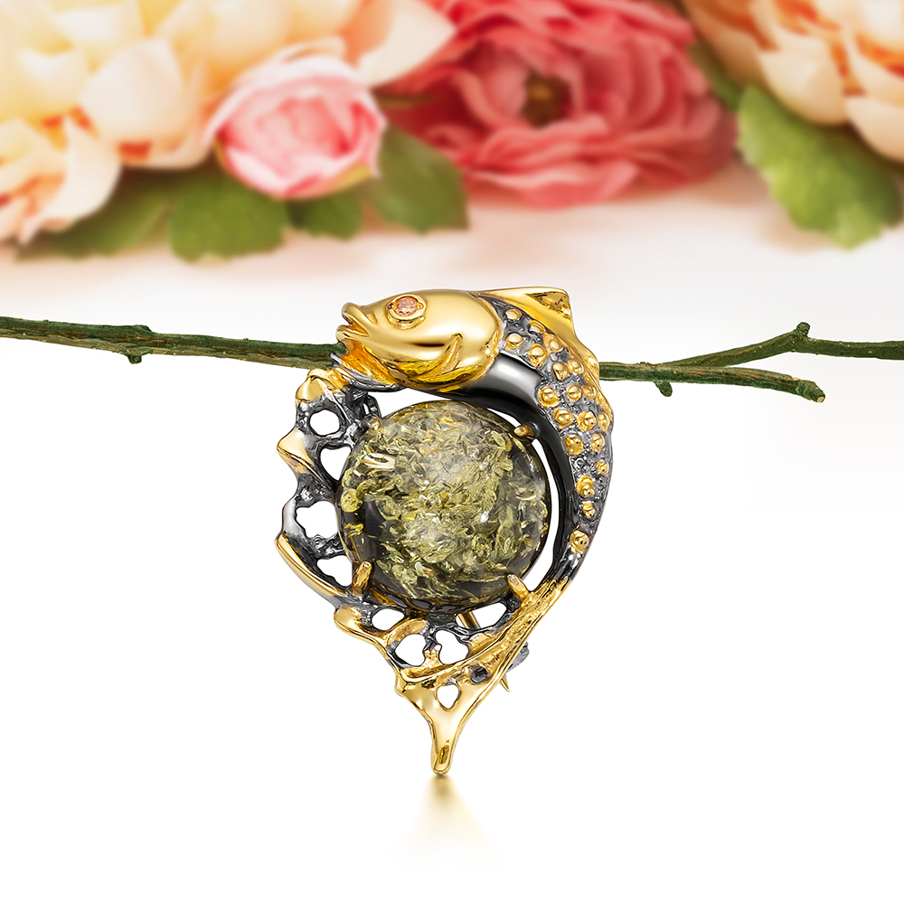 Брошь "Рыбка" из серебра 925 пробы с зеленым балтийским янтарем