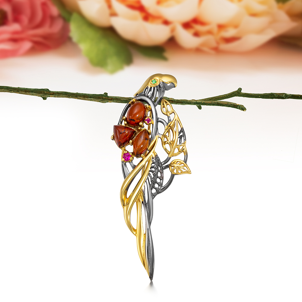 Брошь "Попугай" из серебра 925 пробы с коньячным природным янтарем