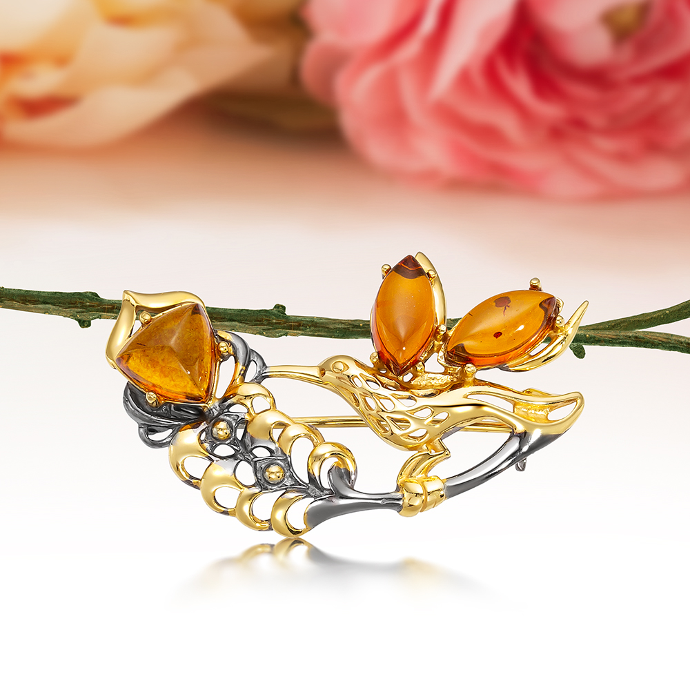 Брошь "Птица" из серебра 925 пробы с коньячным природным янтарем