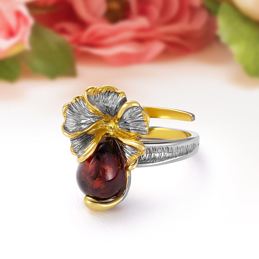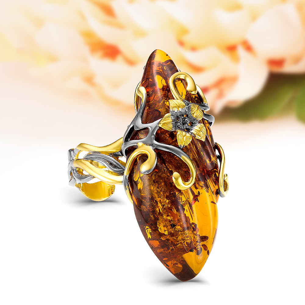 Кольцо "Фиалки" из серебра 925 пробы с коньячным балтийским янтарем