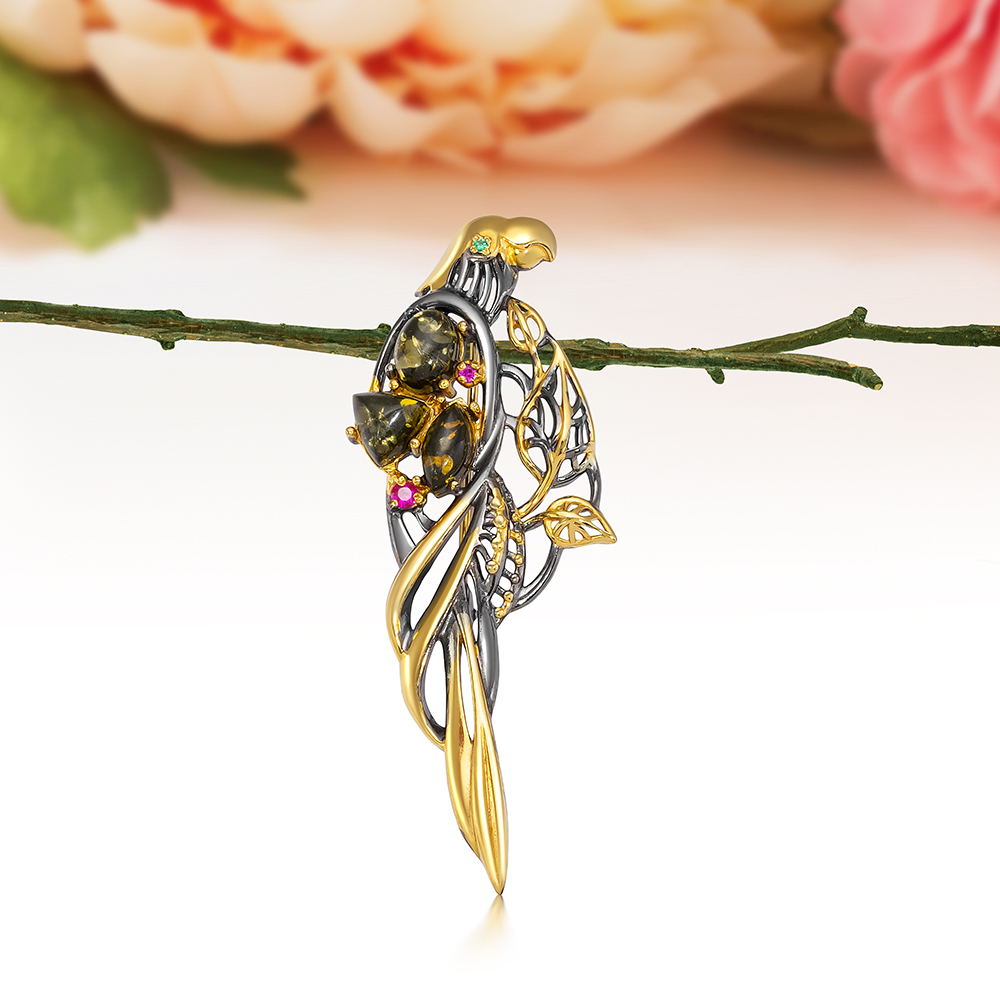 Брошь "Попугай" из серебра 925 пробы с зеленым природным янтарем