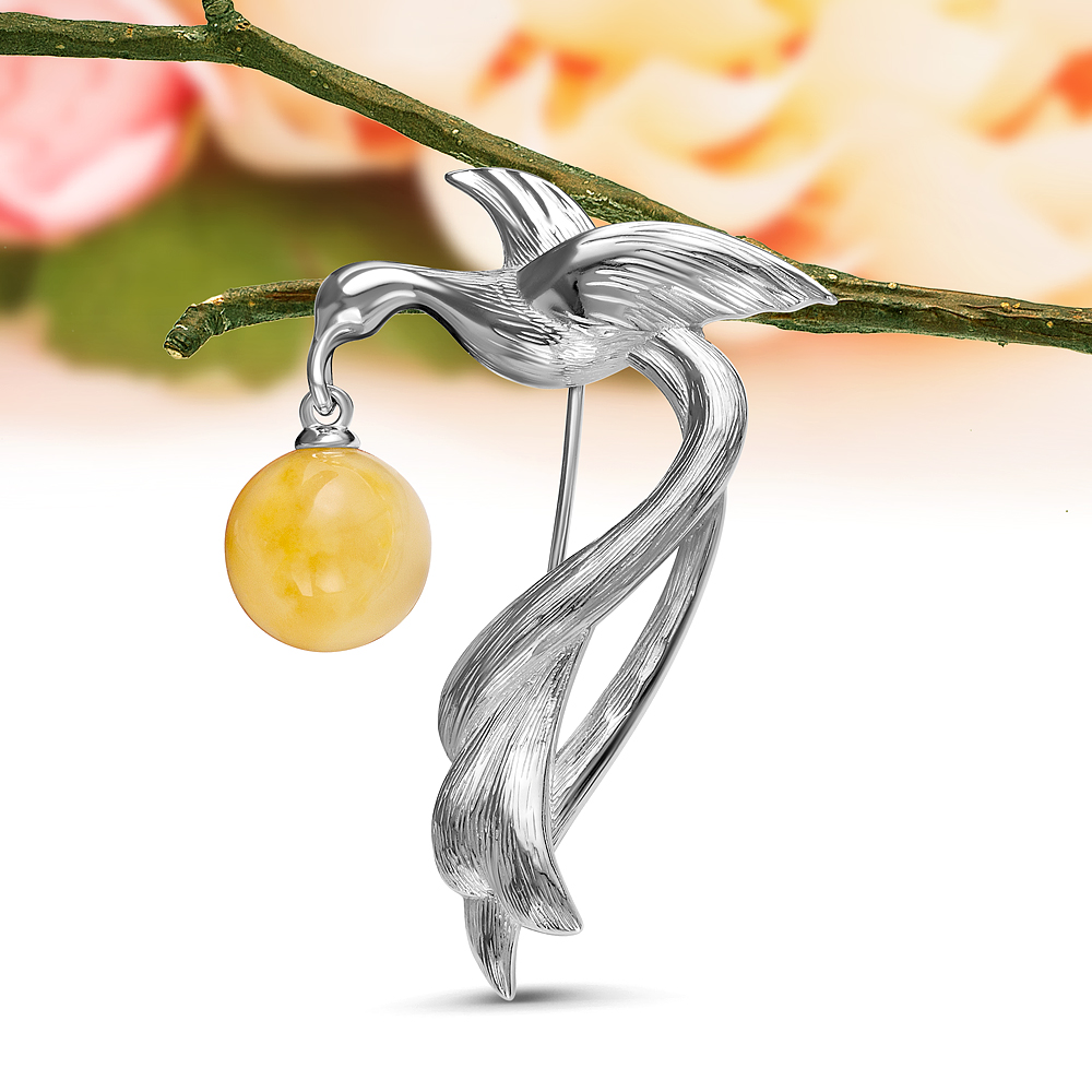 Брошь "Птица" из серебра 925 пробы с лимонным природным балтийским янтарем