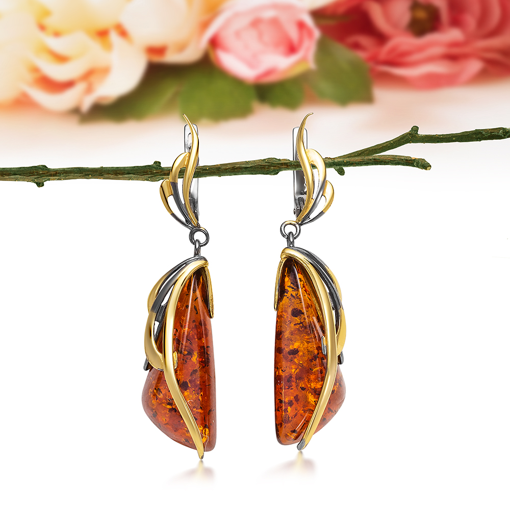 Серьги из серебра 925 пробы, украшенные коньячным балтийским янтарем