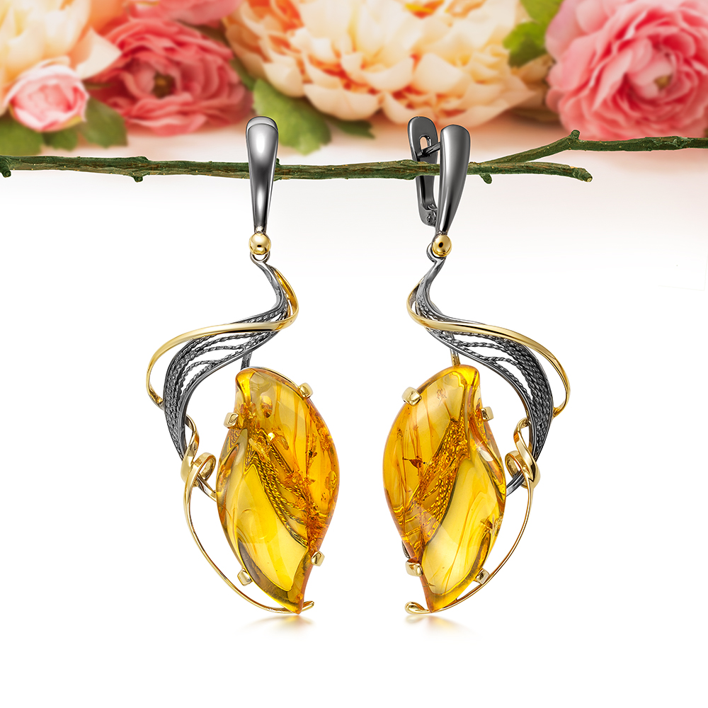 Серьги из серебра, украшенные золотистым балтийским янтарем