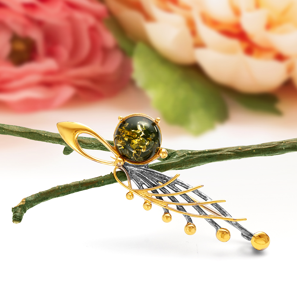 Браслет из серебра 925 пробы с позолотой с зеленым балтийским янтарем, артикул 11272