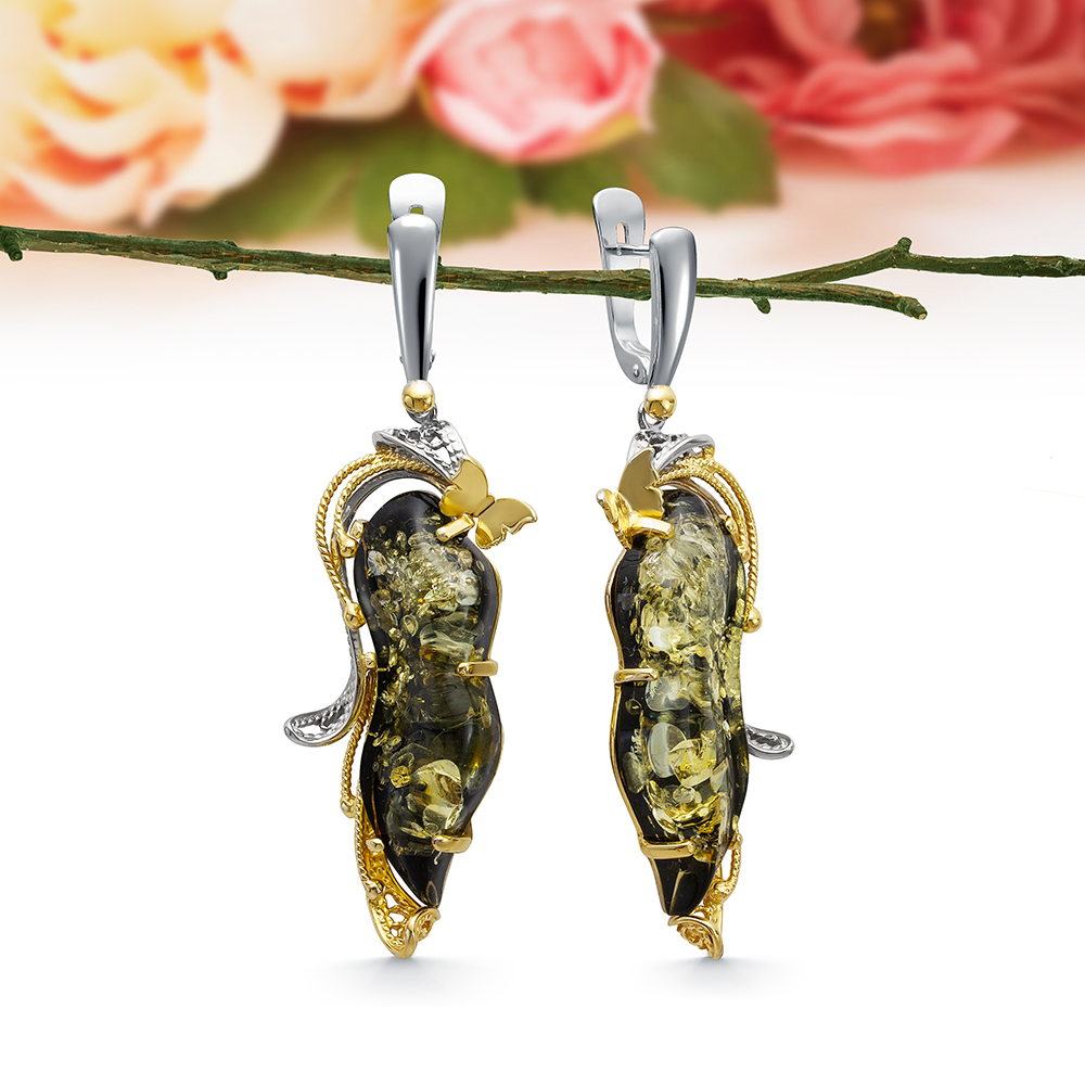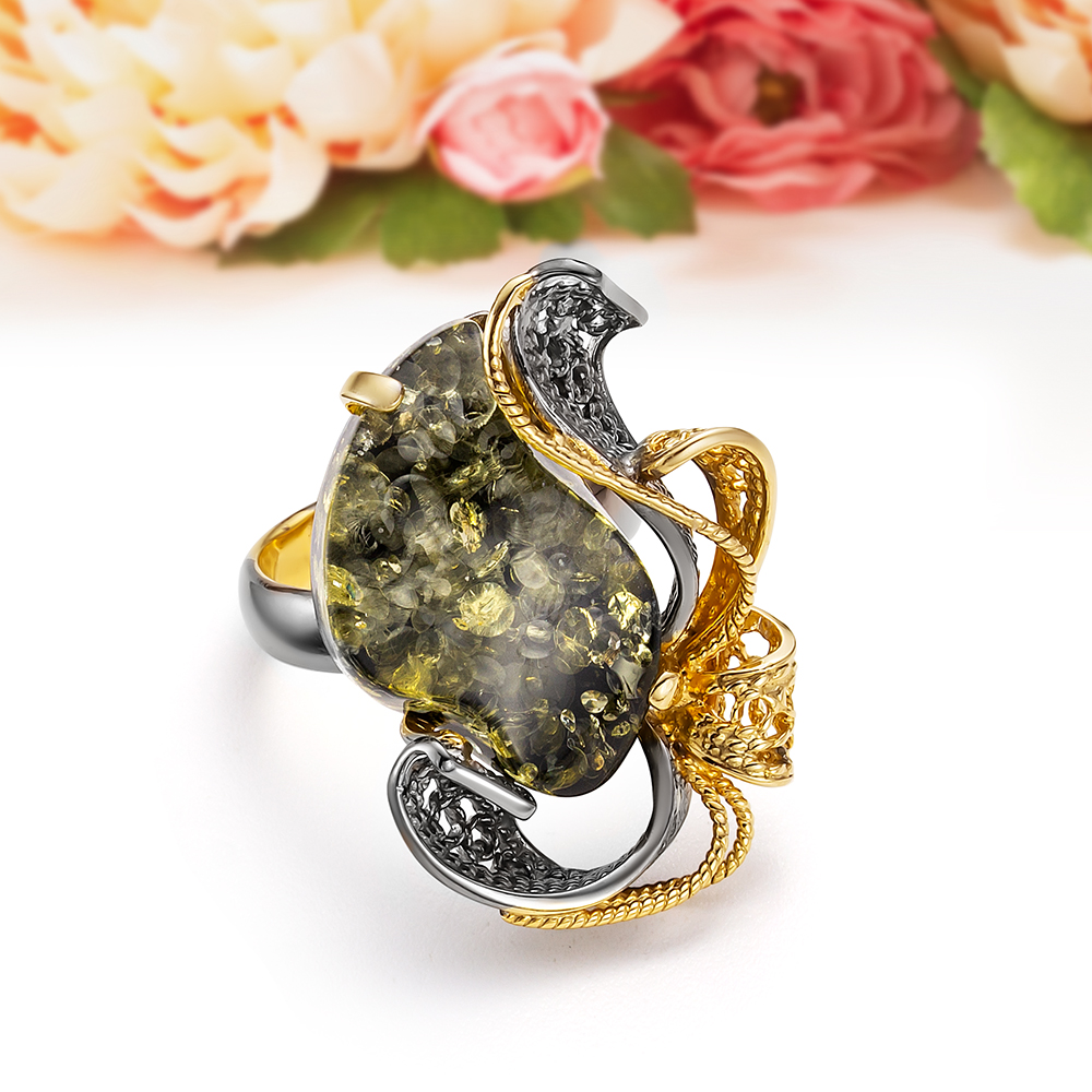 Кольцо из серебра 925 пробы с зеленым природным балтийским янтарем, артикул 12637