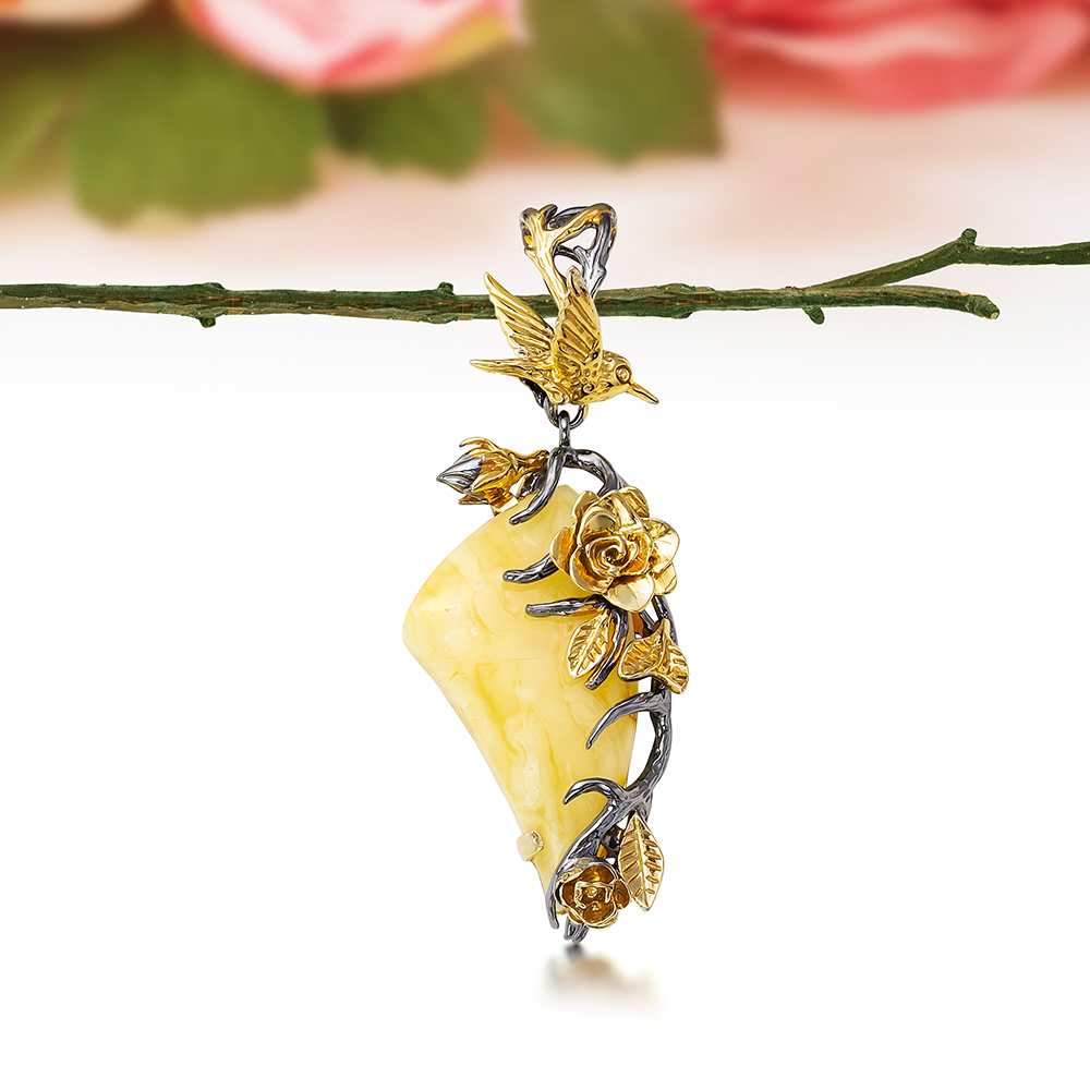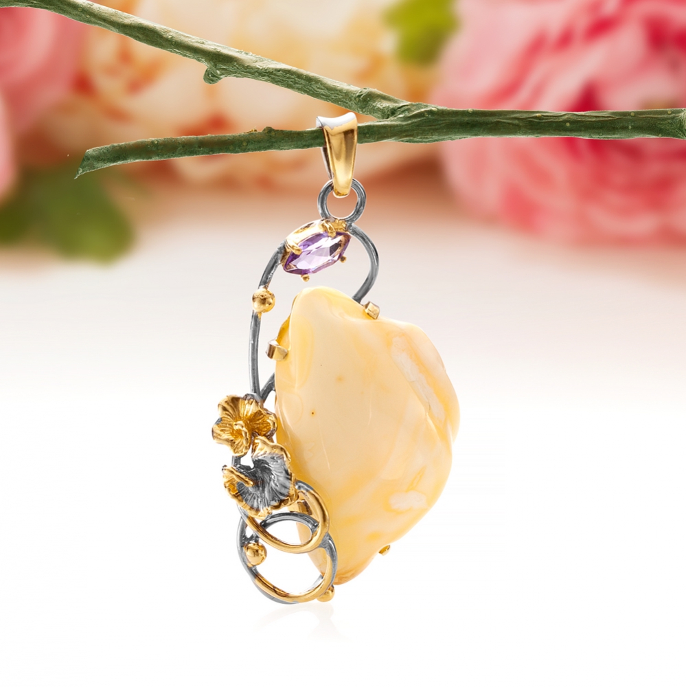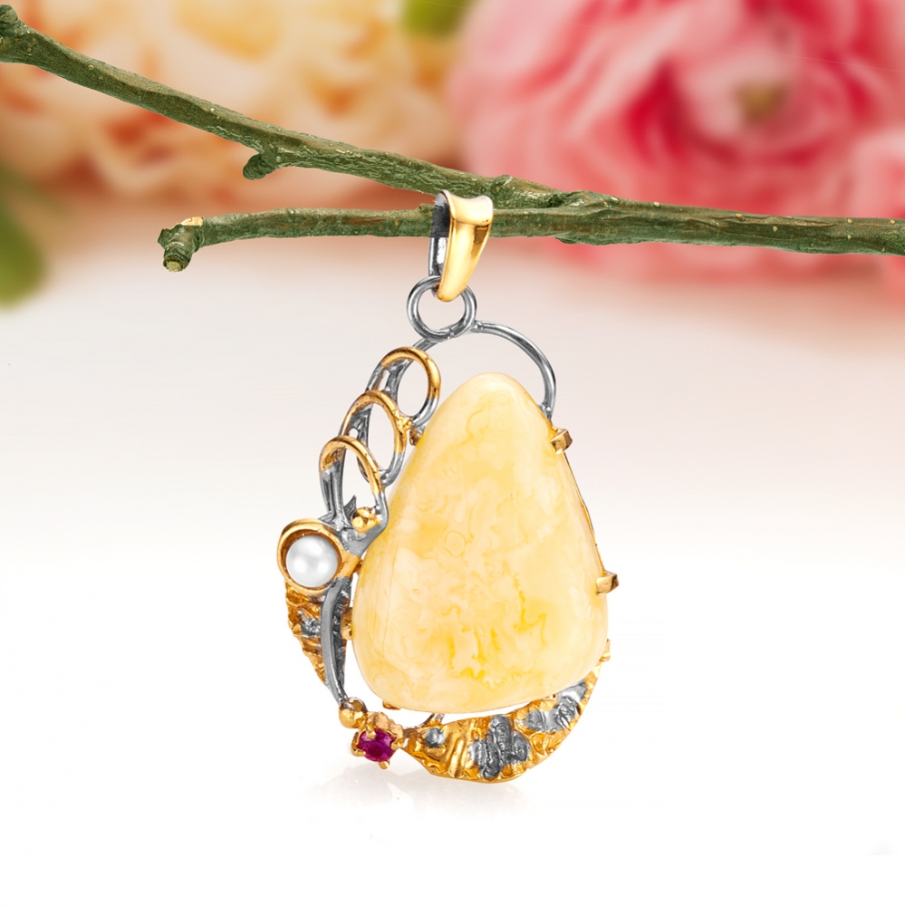 Кулон из серебра 925 пробы, украшенный природным янтарем, артикул 11497