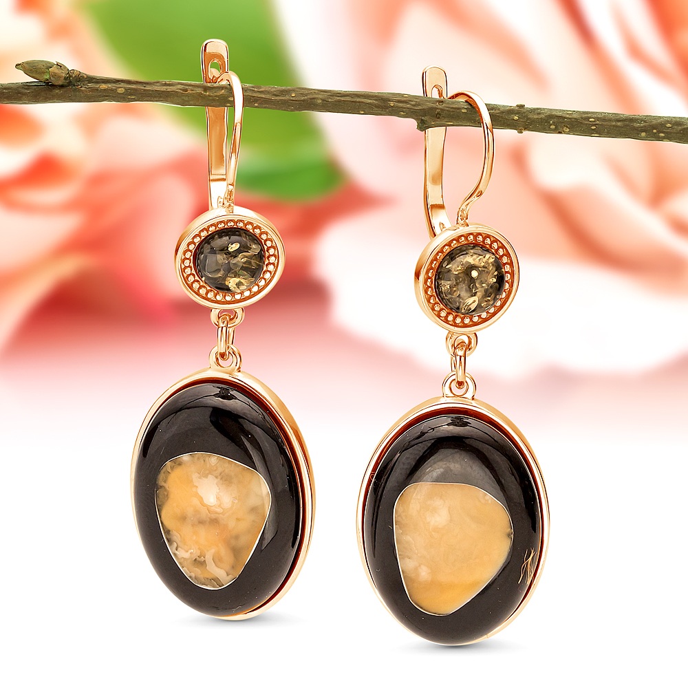 Серьги из серебра 925 пробы, украшенные природным янтарем "микс", артикул 10866
