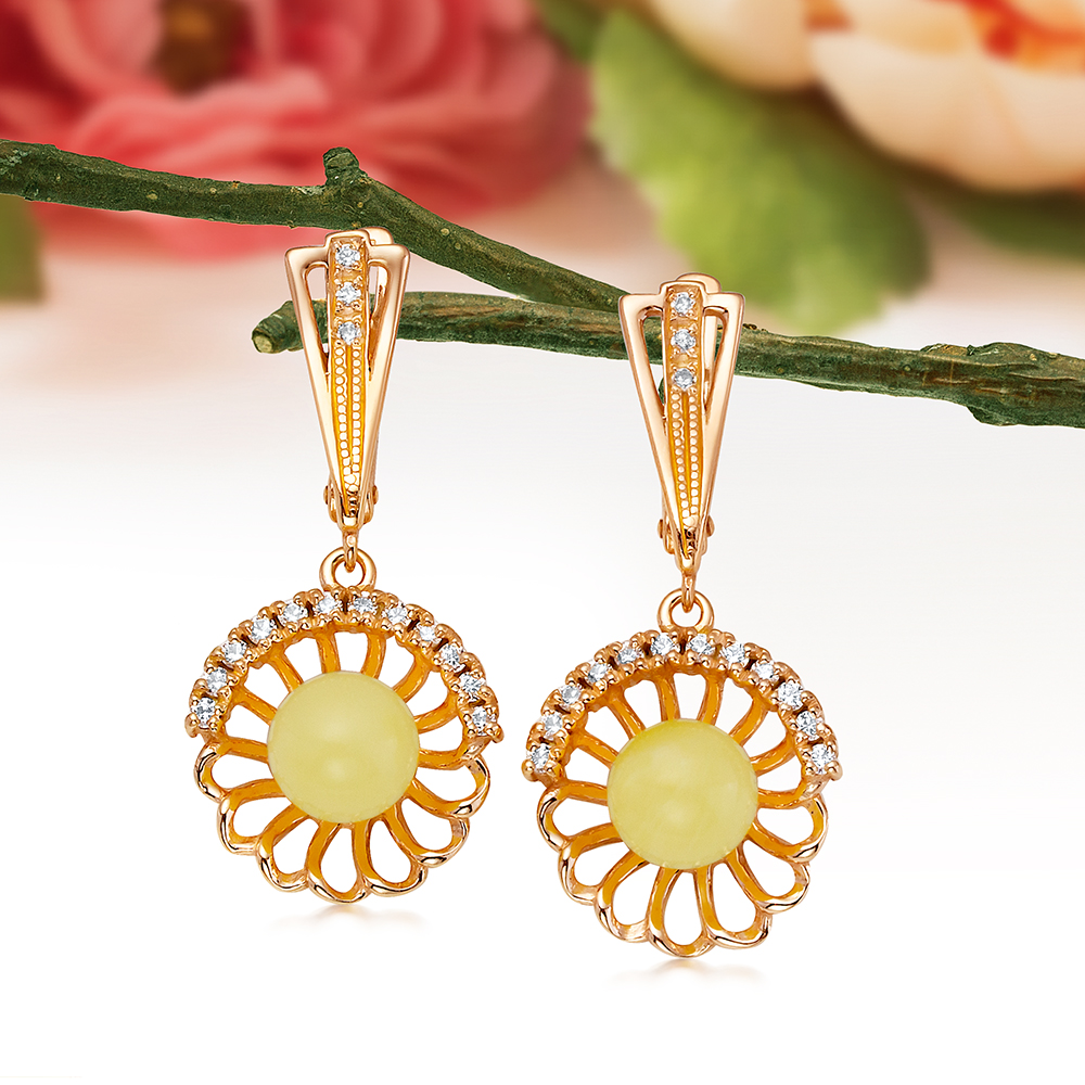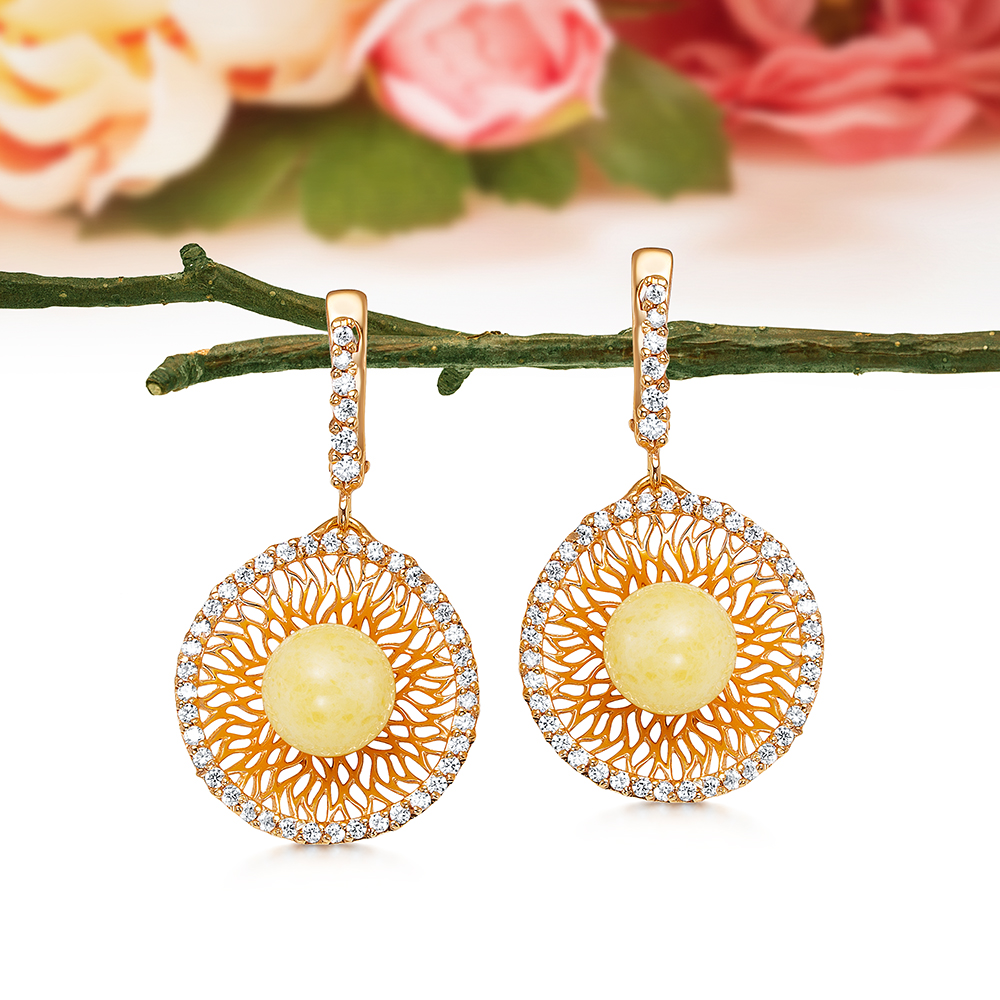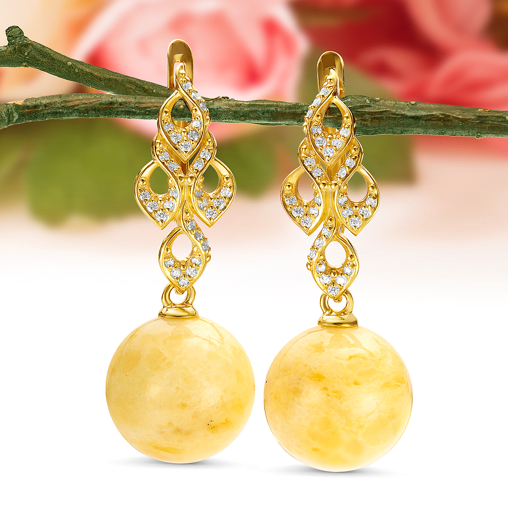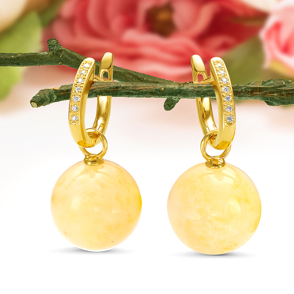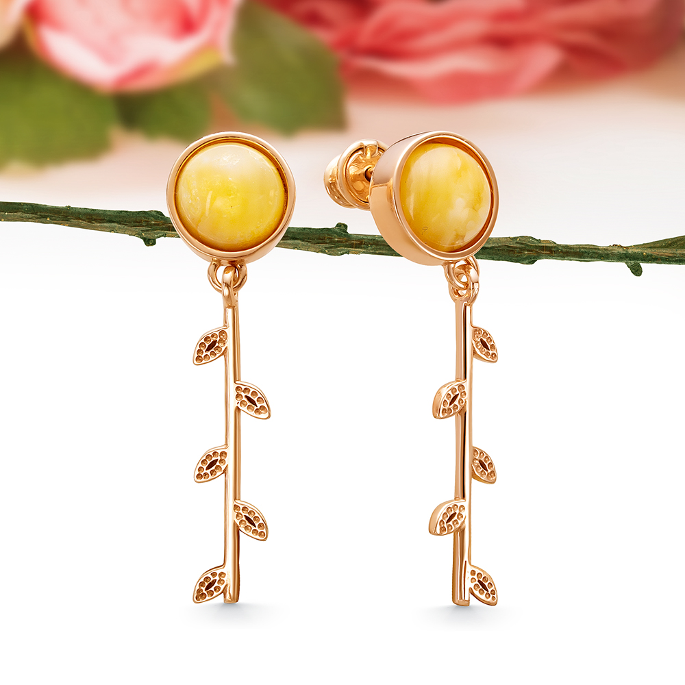 Серьги из серебра 925 пробы, украшенные лимонным природным янтарем, артикул 11397