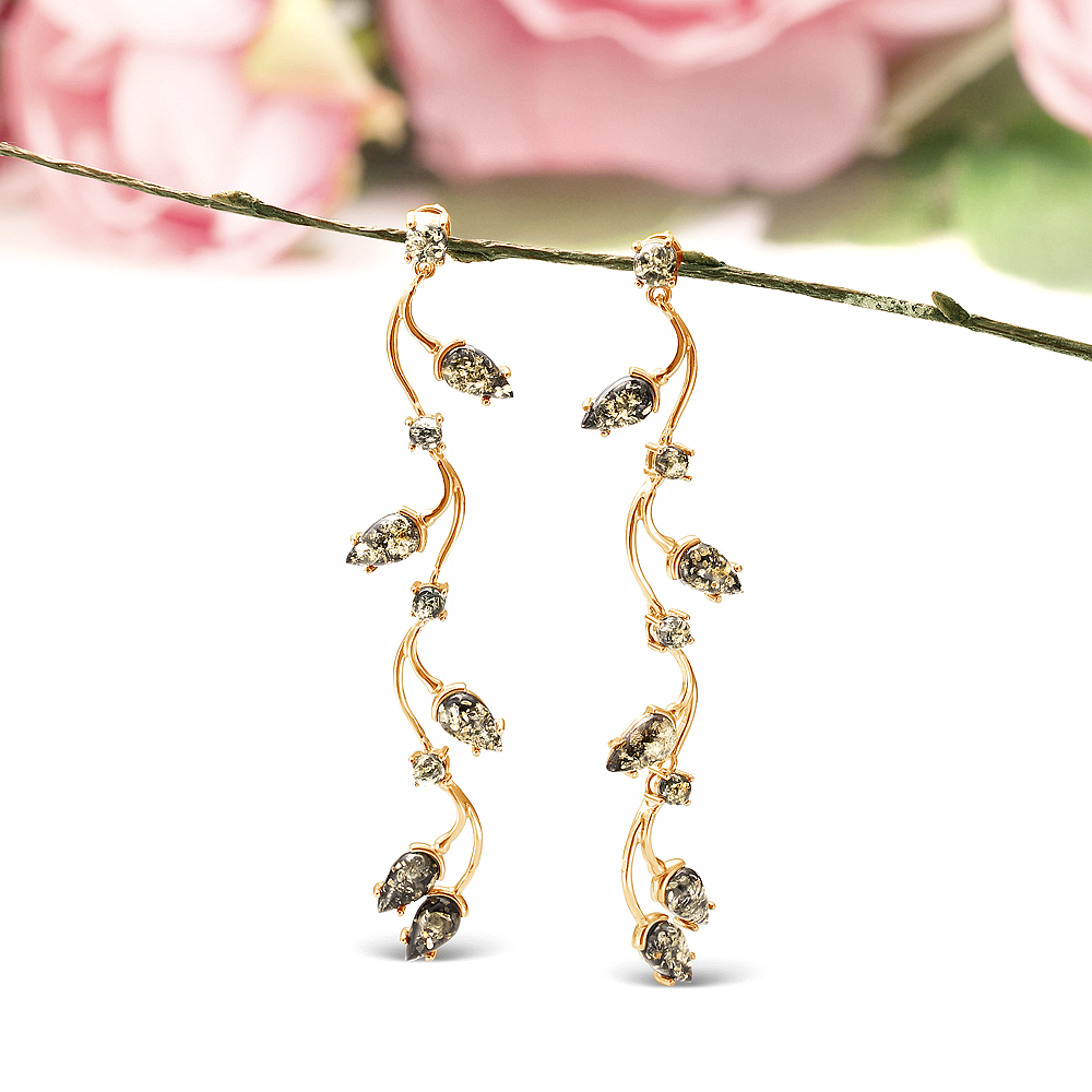 Серьги из серебра 925 пробы, украшенные зеленым природным янтарем, артикул 11751