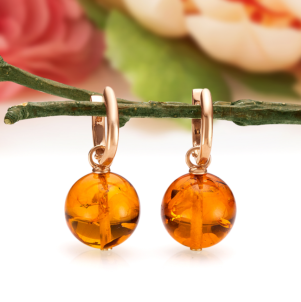 Серьги из золота 585 пробы, украшенные золотистым балтийским янтарем, артикул 11042