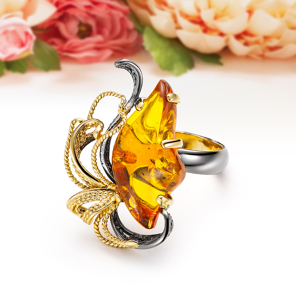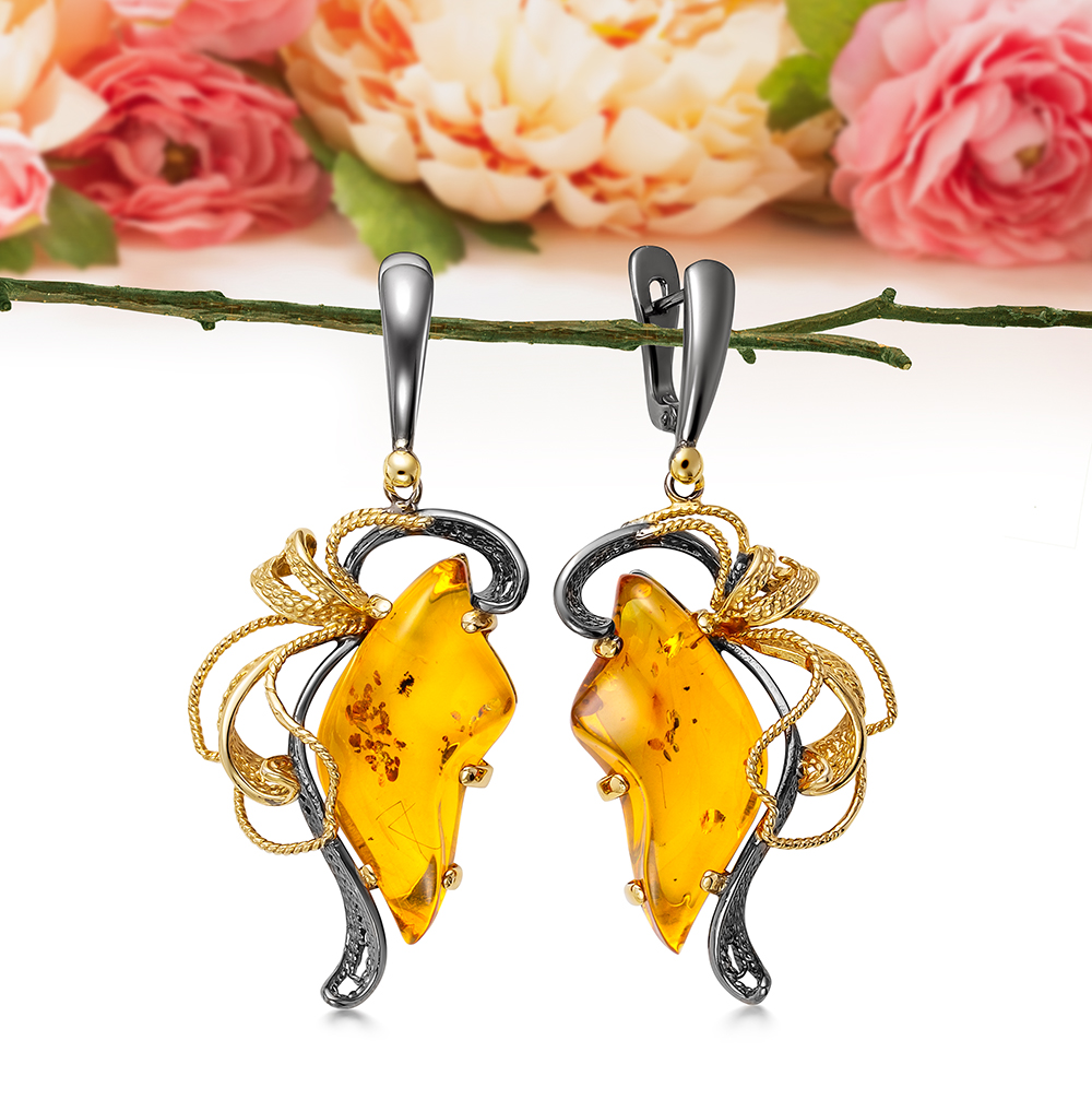 Серьги из серебра, украшенные золотистым балтийским янтарем, артикул 11994