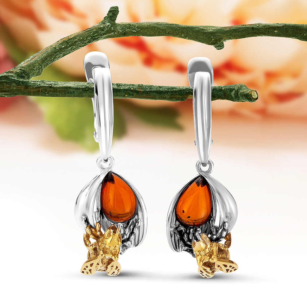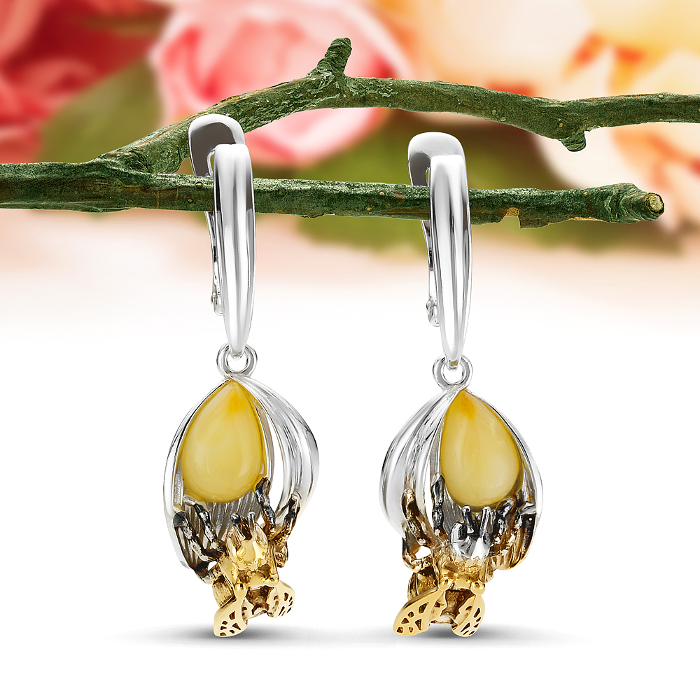 Серьги "Медовые" из серебра 925 пробы, украшенные лимонным янтарем, артикул 11692