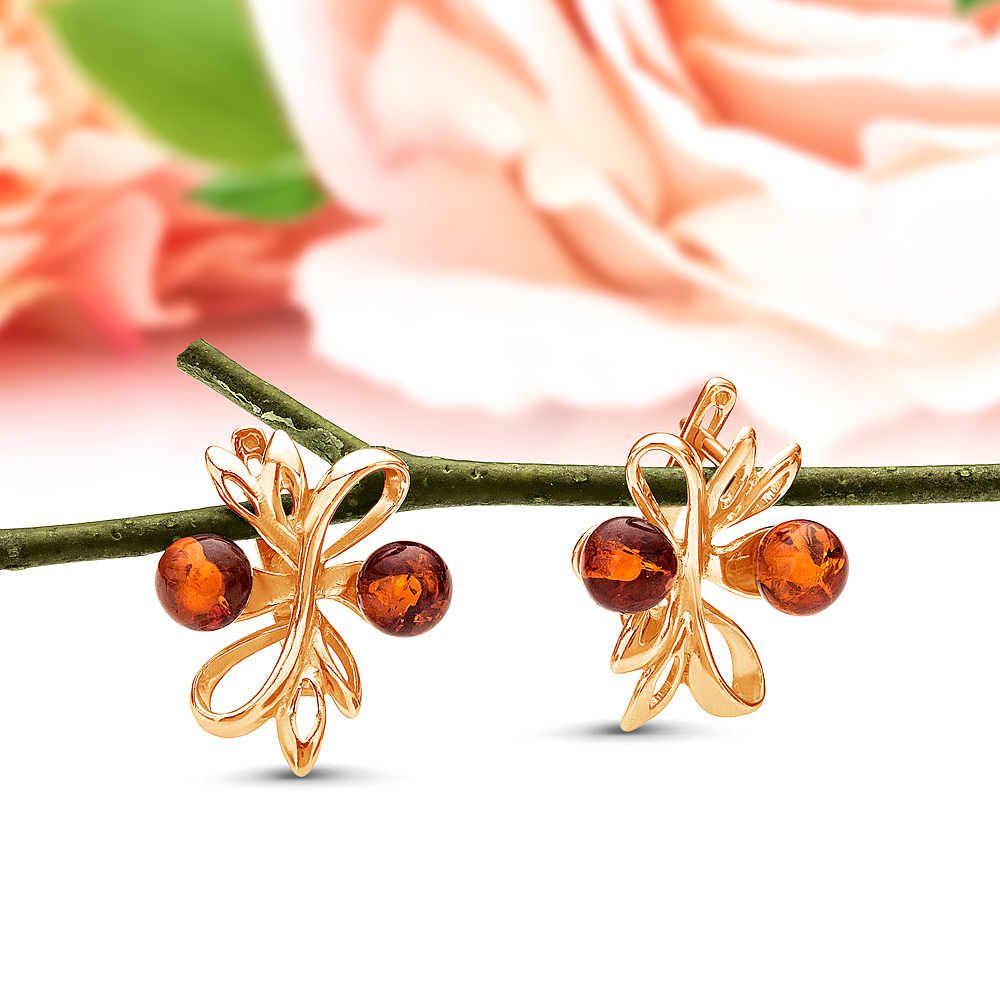 Серьги "Бабочки" из серебра 925 пробы, украшенные коньячным янтарем