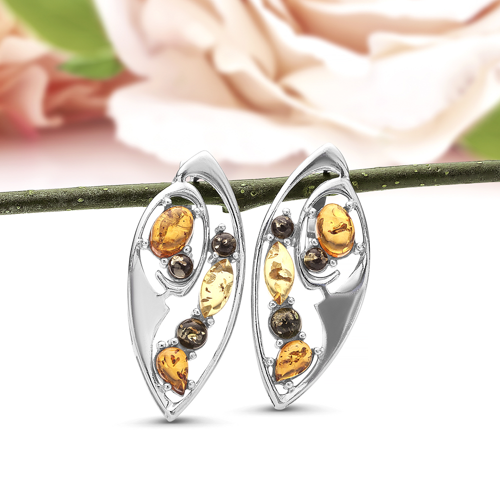 Серьги из серебра 925 пробы, украшенные природным янтарем "микс"