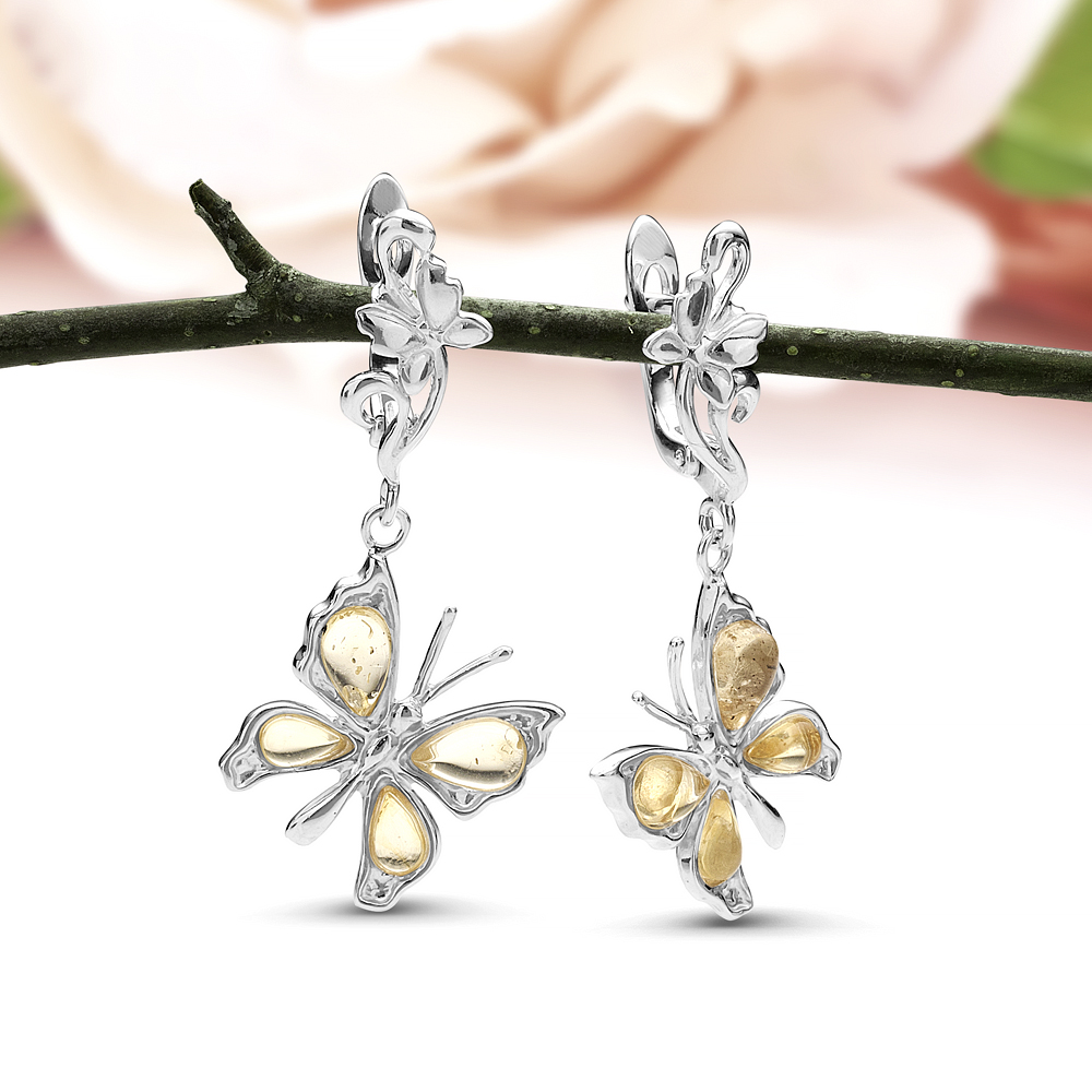 Серьги "Бабочки" из серебра 925 пробы, украшенные золотистым янтарем