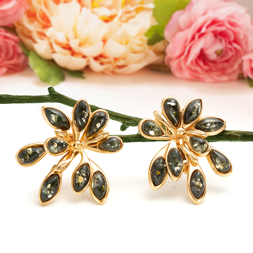 Серьги с зеленым янтарем