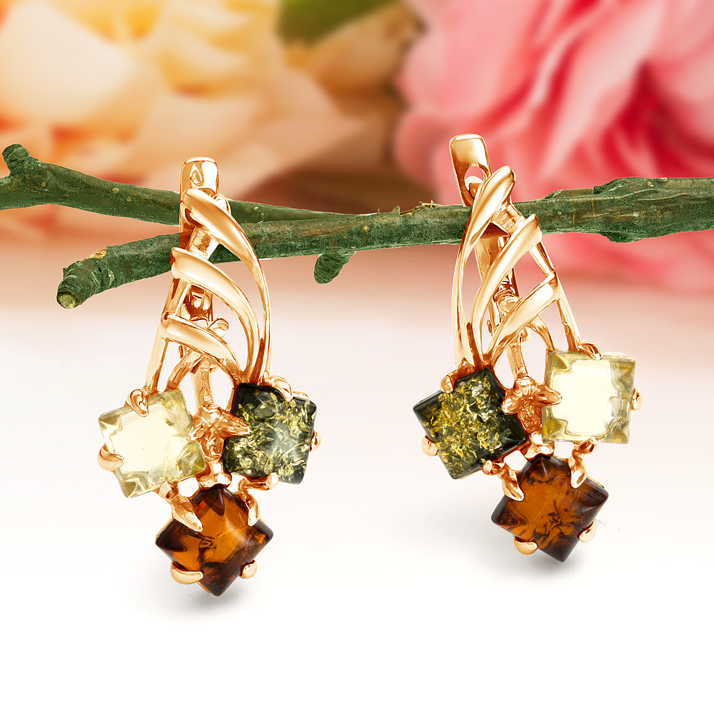 Серьги из серебра 925 пробы, украшенные природным янтарем "микс"