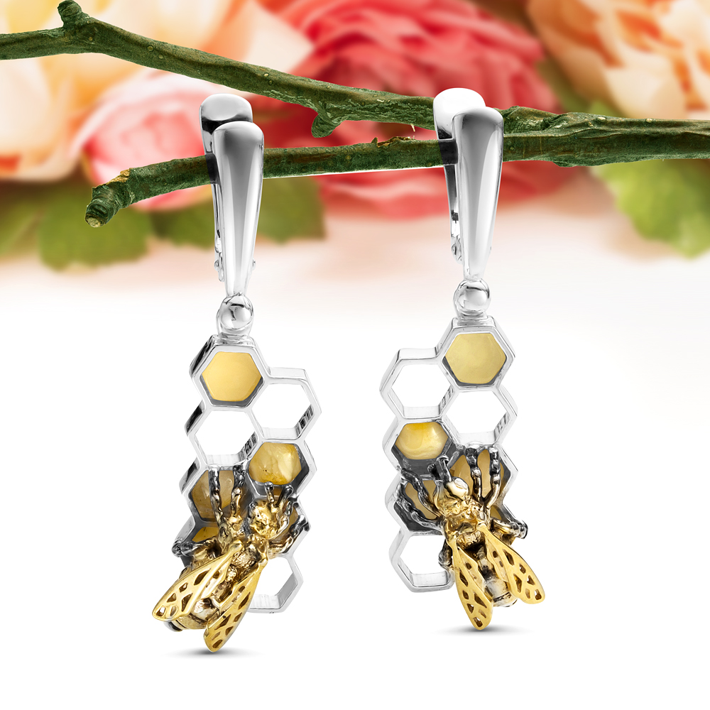 Пусеты "Диор" из серебра 925 пробы, украшенные золотистым янтарем