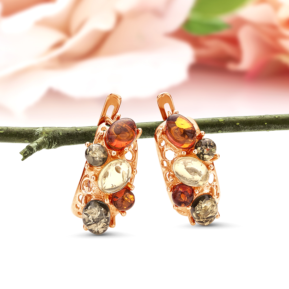 Серьги из серебра 925 пробы, украшенные природным янтарем "микс"